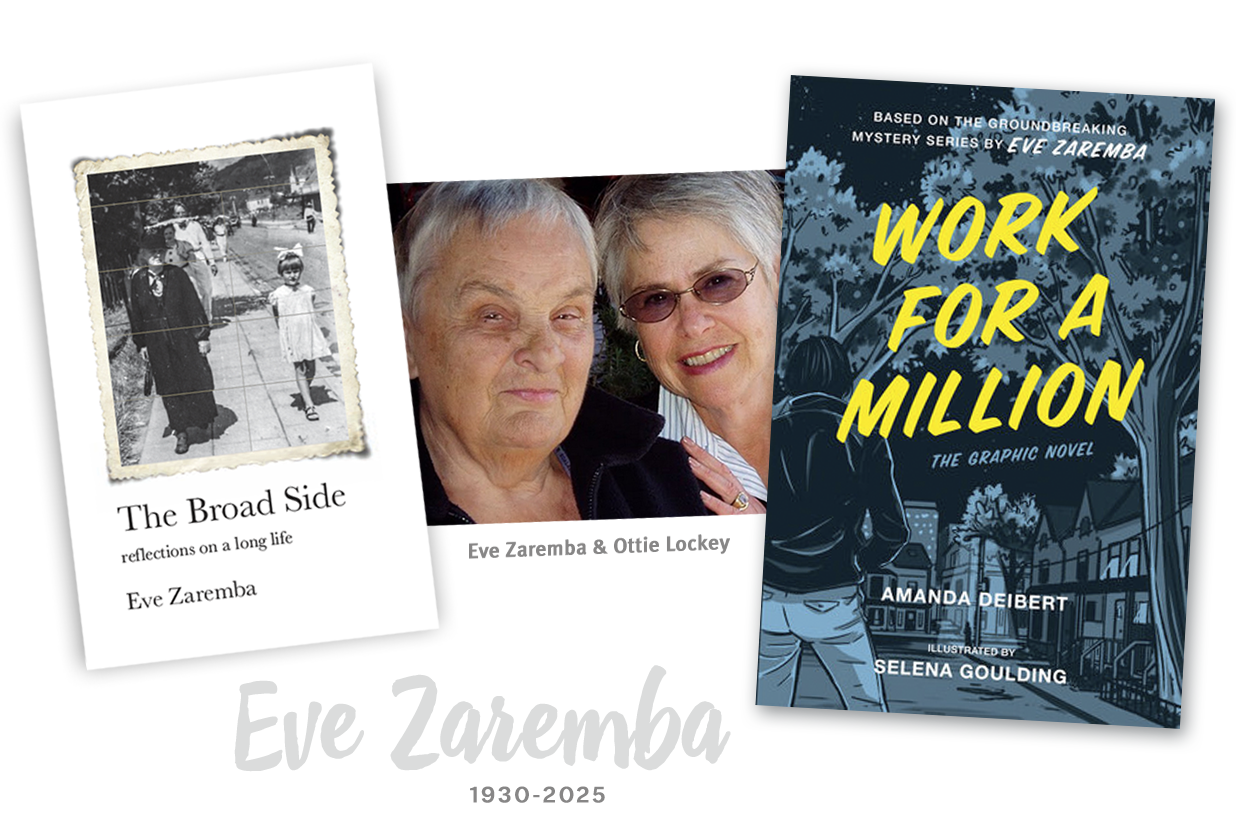 Eve Zaremba is the author of six mystery novels featuring lesbian private detective, Helen Keremos. Now 40 years after she arrived on the scene, Helen Keremos has returned in a graphic novel, Work for a Million—adaptation written by Amanda Deibert, illustrated by Selena Goulding and published by McClelland & Stewart. Her memoir, The Broad Side, Reflections on a Long Life, was published in 2015.